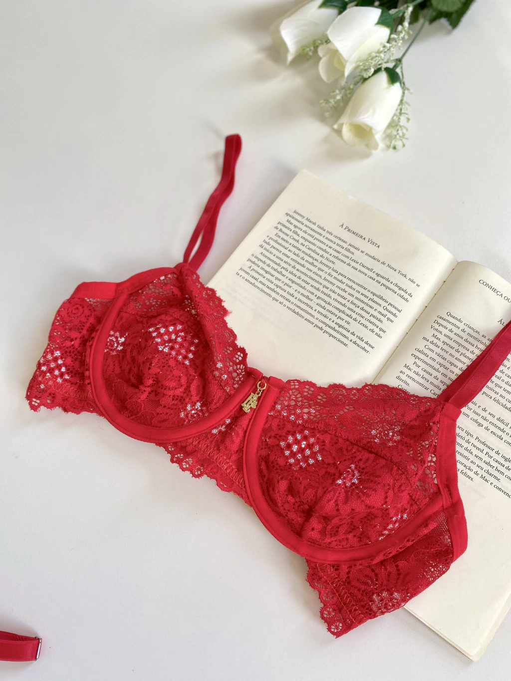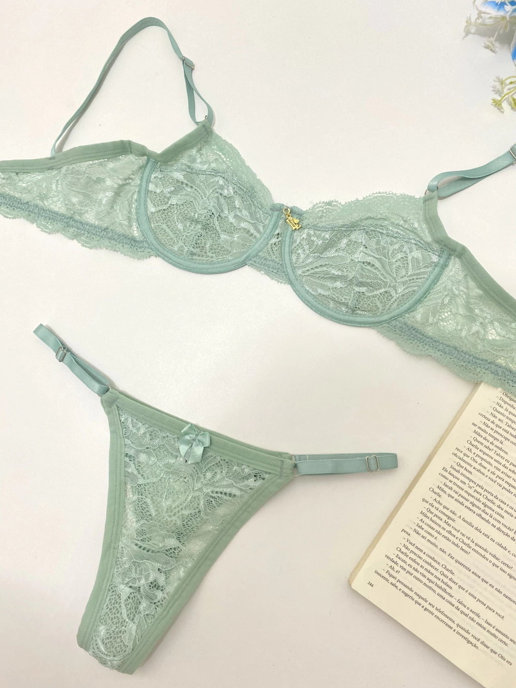 Conjunto sem bojo, com aro, forrado no busto, calcinha fio com regulagem.